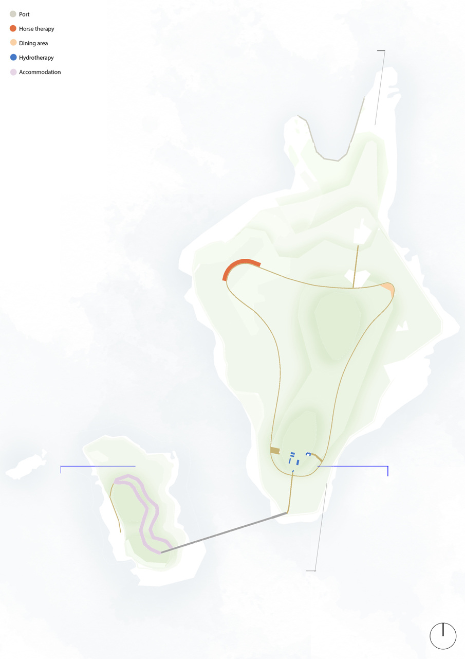 The Diapontian Islands, although are a quiet destination for relaxation, are not characterized by large numbers of tourism. Also, some of the uninhabited islands belong to the Diapontian Islands. Combining the two above, we decided to use two of the uninhabited islands, Diaplo and Diakopo between Corfu and Mathraki, to develop a program that will attract both a specific group of people and tourists. The basic idea, then, is the therapy and rehabilitation of people suffering from various illnesses and injuries, as well as psychotherapy and entertainment for people who are extremely healthy. The largest of these two islands includes therapeutic functions such as massage, hydrotherapy, horse therapy, and lunch, while the smaller island contains accommodation for visitors to the island. The two islands are connected by a bridge. Diakopo has a port that welcomes guests.