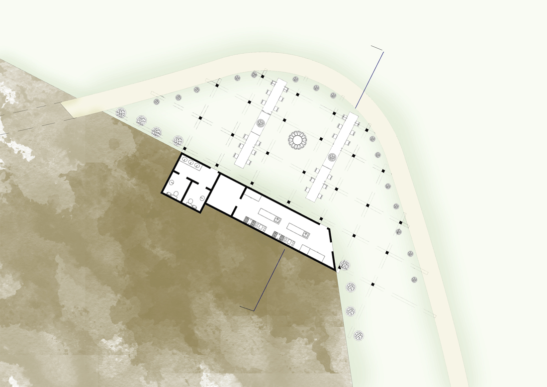 The accommodation units are connected by a covered corridor. In the gaps between the accommodation units there are crops that can be consumed by guests throughout their stay there. From this route you can access a beach.